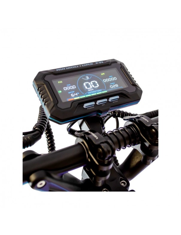 Ecran EY4 LCD Bluetooth : vitesse, autonomie, batterie, mode de conduite en temps reel. Connexion a l'application Minimotors iOS/Android pour personnaliser les reglages, verrouiller la trottinette et surveiller les parametres.